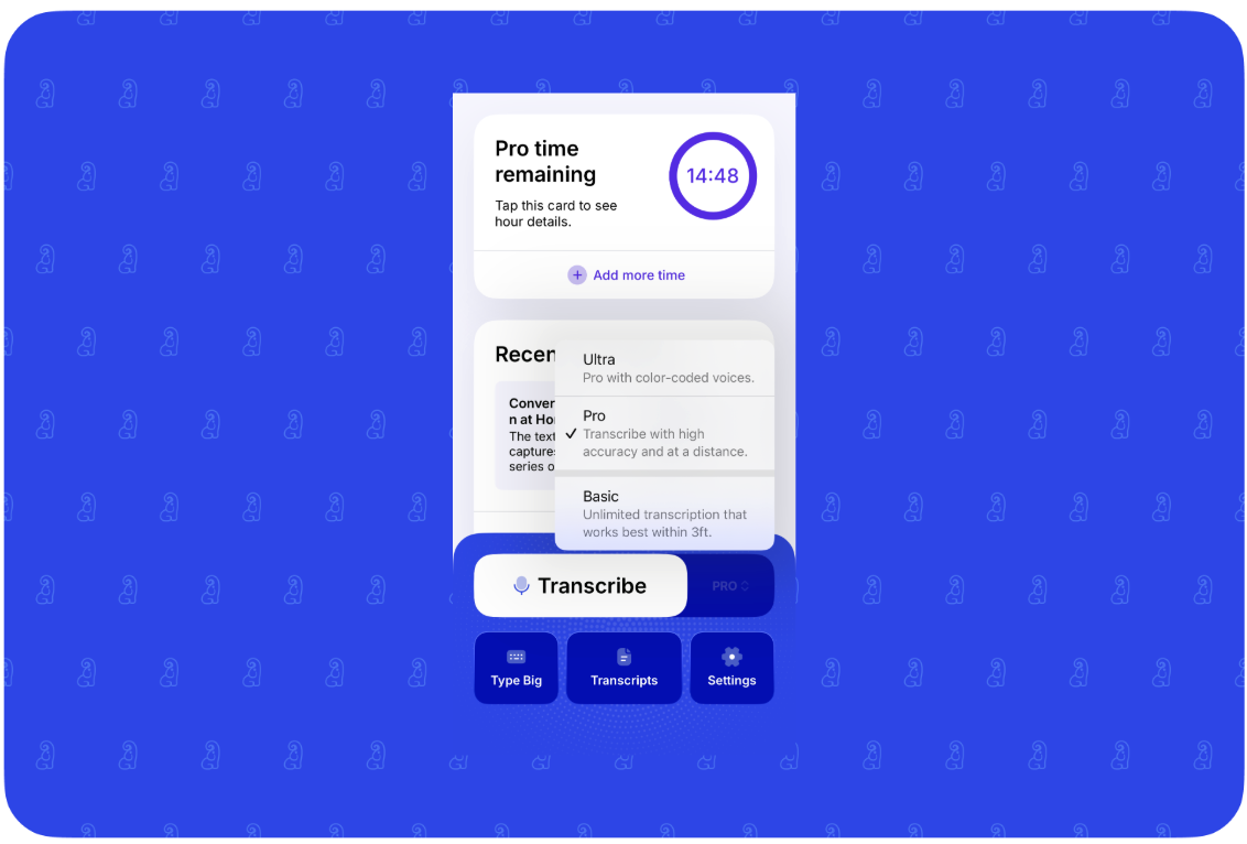 Live Transcribe offers three transcription modes—Basic, Pro, and Ultra—designed to fit different environments and needs. Whether you're having a quiet, in-person conversation or trying to capture speech from across a room, you can choose the mode that works best for you. Each option balances accuracy, features, and cost to give you flexibility and control.
